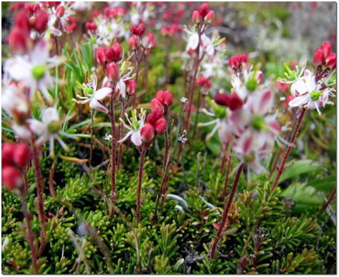 つぼみのときには赤く、開くと白い花びらと雄しべが目立つ花で、寒冷地の高山での短い夏の間に花茎を伸ばし精一杯の力でさいているように感じます。