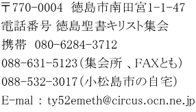 徳島聖書キリスト集会場(徳島市南田宮1丁目1の47 ) 徳島市バス東田宮下車徒歩四分。 |